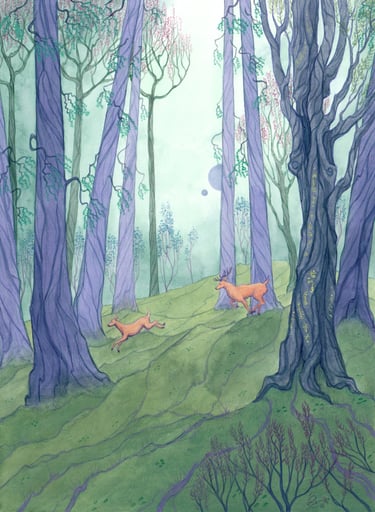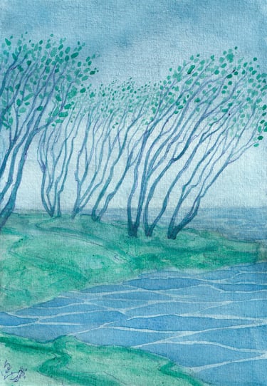 Des arbres et de l'écriture intuitive en fond.