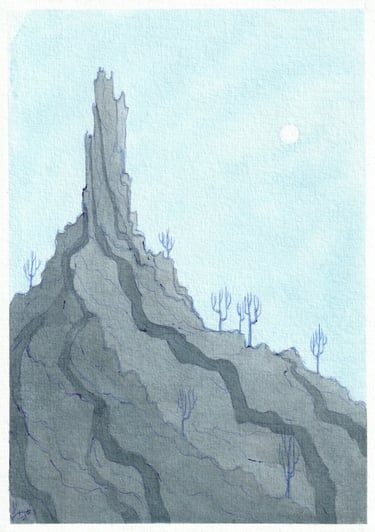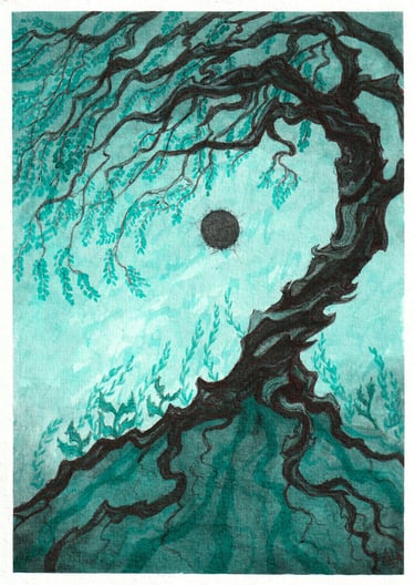 Illustrations à l'encre de chine noire, bleue et verte; réalisées lors du défi Inktober 2022.